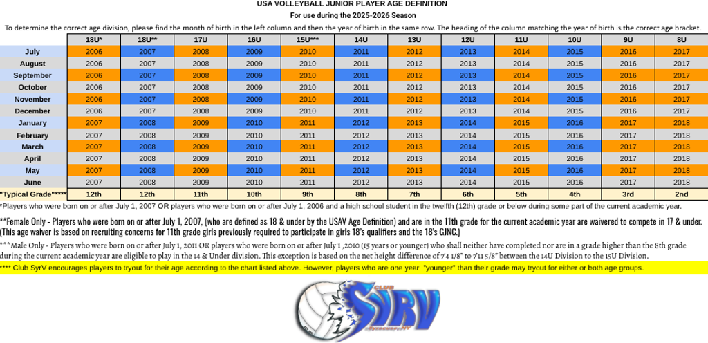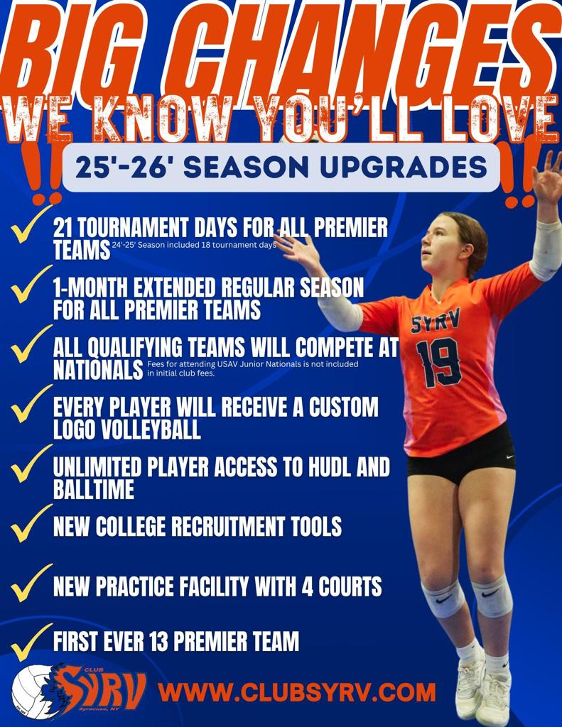 All Club SyrV athletes MUST have a valid USA Volleyball and Excelsior membership before participating in any tryout, practice, or tournament. Click the Excelsior image above to register!